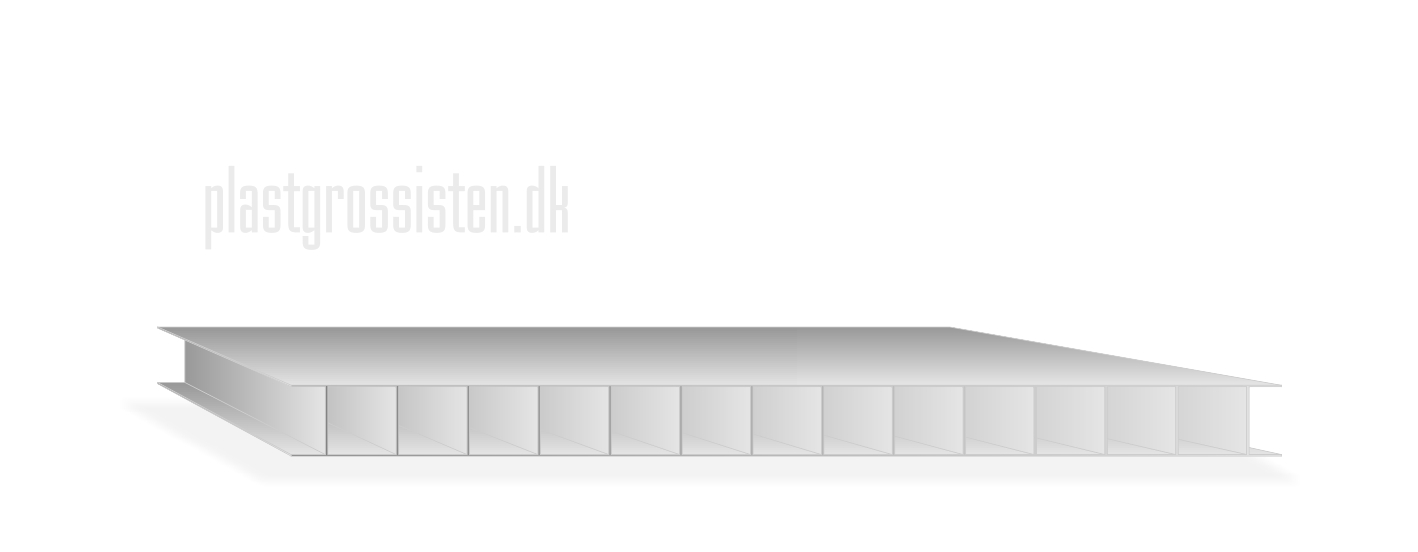 4mm klar 2-lags kanalplade af uv-stabiliseret polycarbonat. Kan skrues direkte fast på spær og lægter. God til afdækningsopgaver, eksempelvis cykelskure, drivhuse, carporte og lignende.