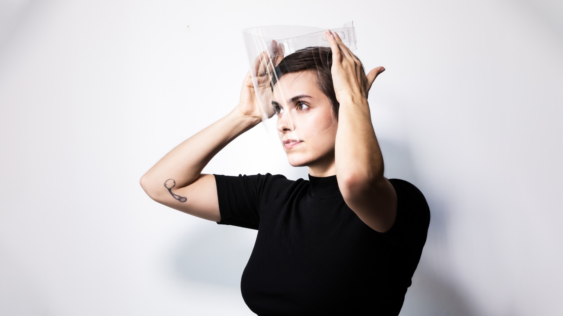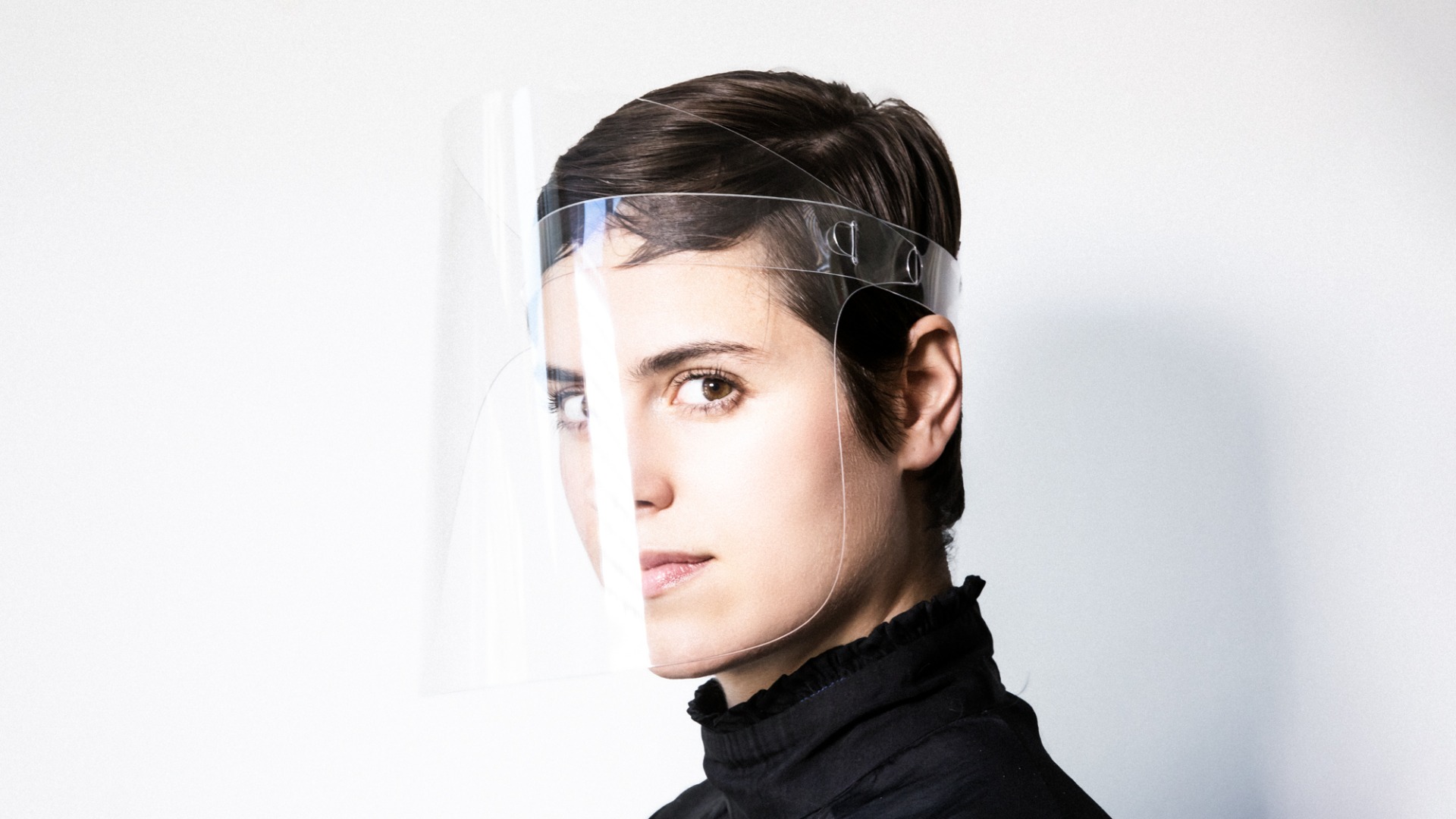 Ansigtsvisir der beskytter øjne, næse og mund, bestående af klar visirplade med hvide pandebånd.