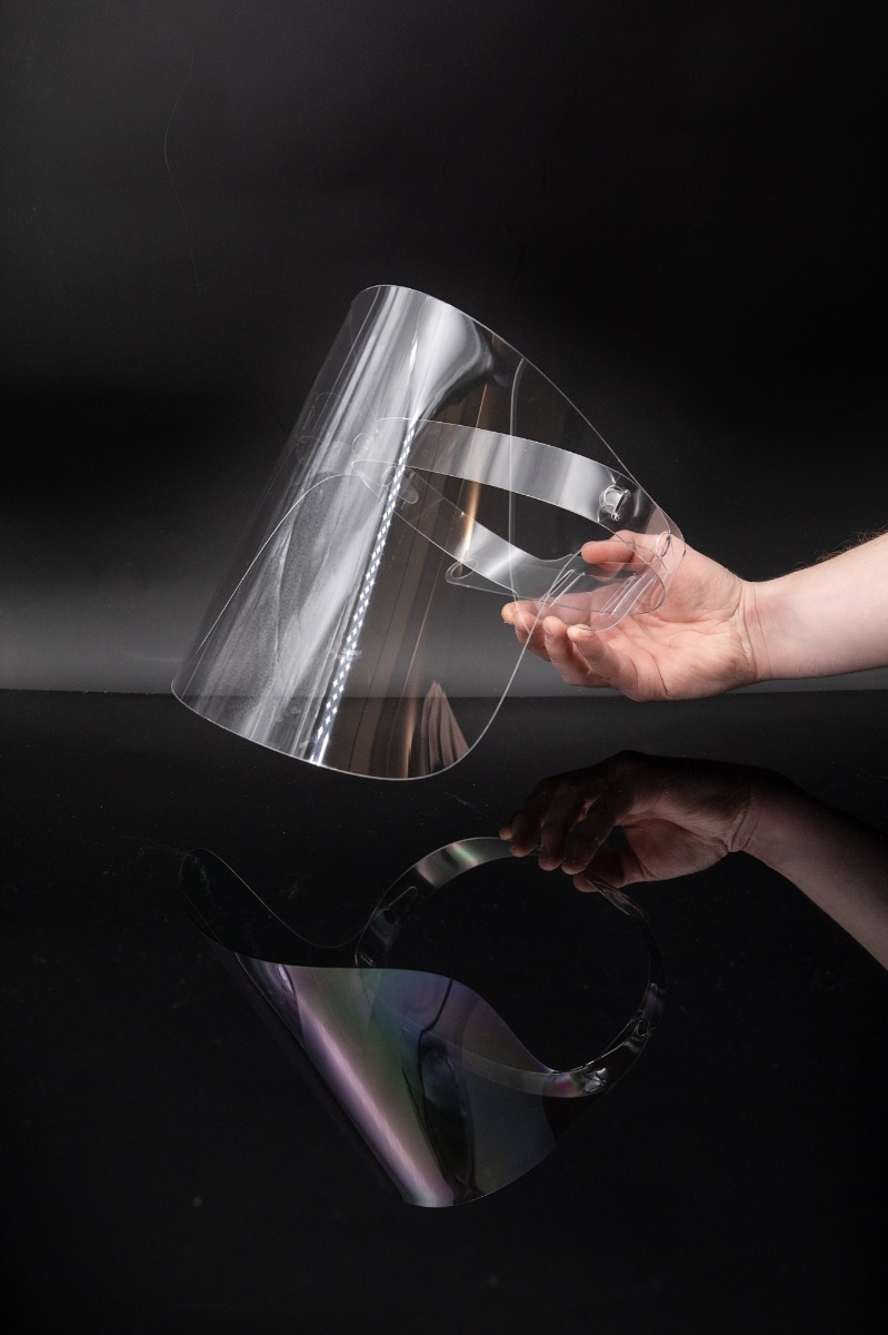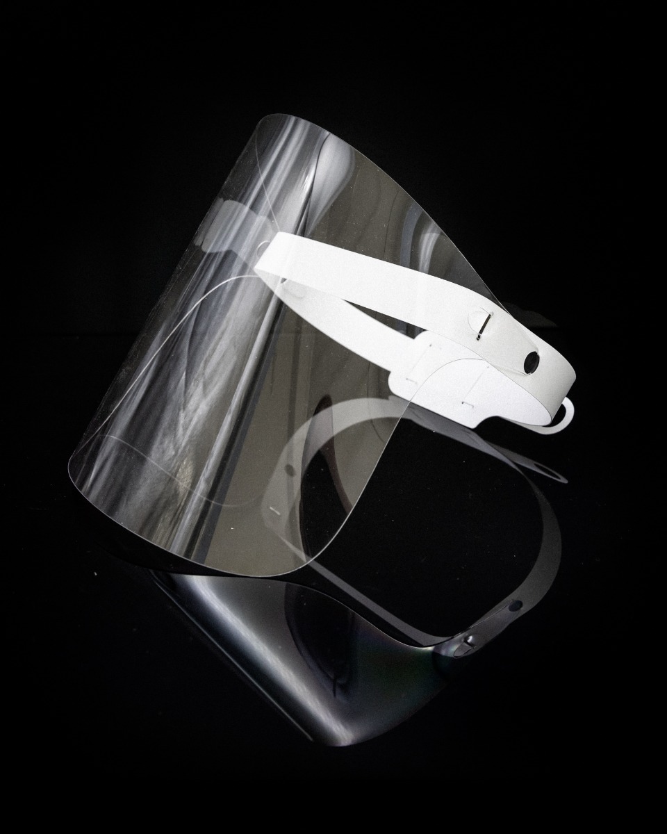 Ansigtsvisir der beskytter øjne, næse og mund, bestående af klar visirplade med hvide pandebånd.