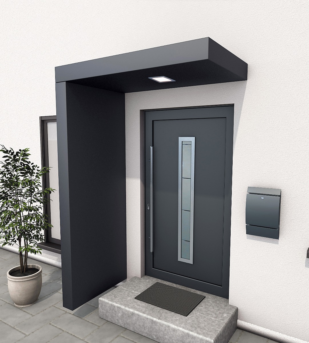Skab en effektfuld og vejrbeskyttet indgang til dit hjem i god stil! Balkadinens kubistiske design og tydelige linier passer til mange forskellige fasader og huse. Balkadinen er bygget af pulverlakeret lauminium i antracit og er med indvendig EPS-isolering, hvilket giver maksimal stabilitet, og minimerer lyden af regn.