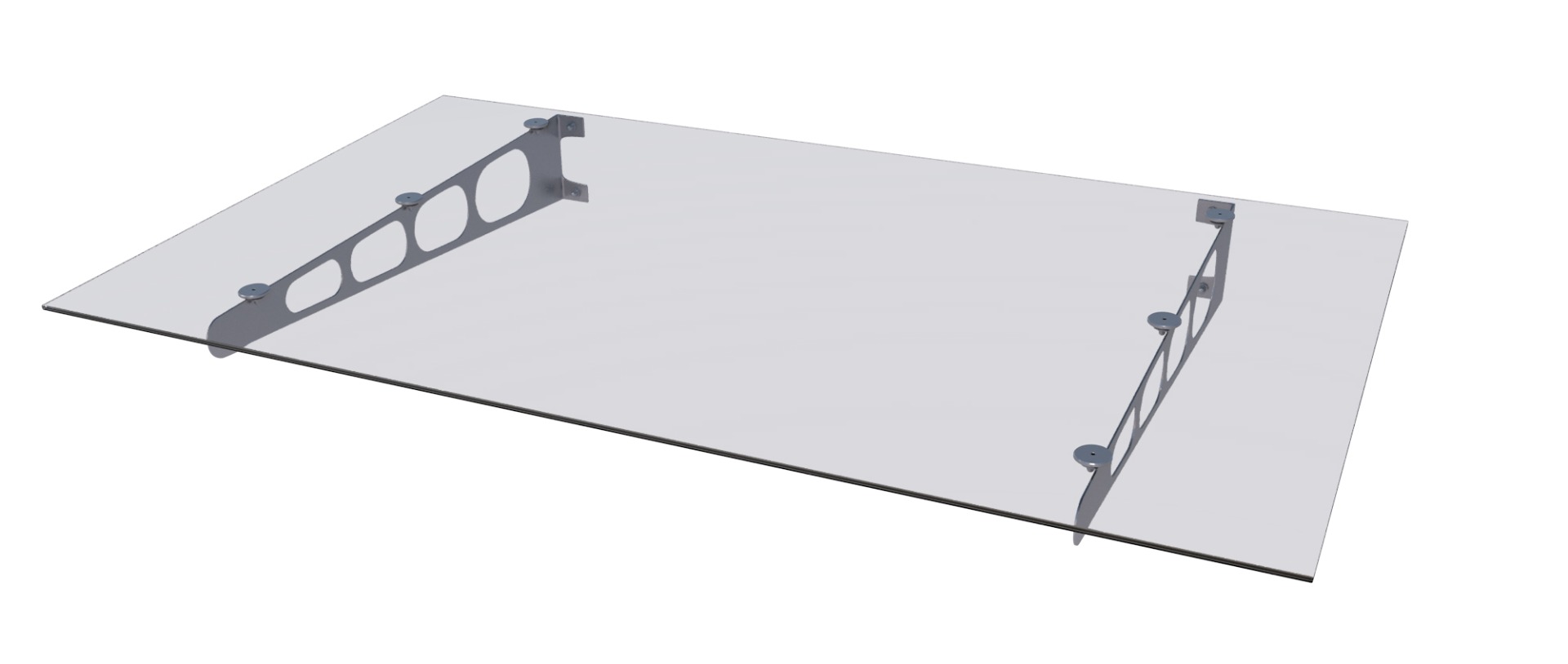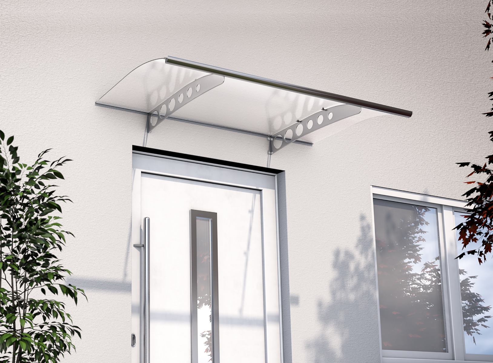 Den gennemsigtige, UV-beskyttede akrylplade hviler på buede, rustfri stålkonsoller, som effektivt leder vand væk fra facaden. Vægbeslag i aluminium sikrer et elegant design, der passer til mange hustyper.