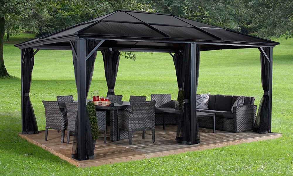 Moderne, stabil og et moderne udseende er hvad der bedst beksriver denne pergola havepavillon.