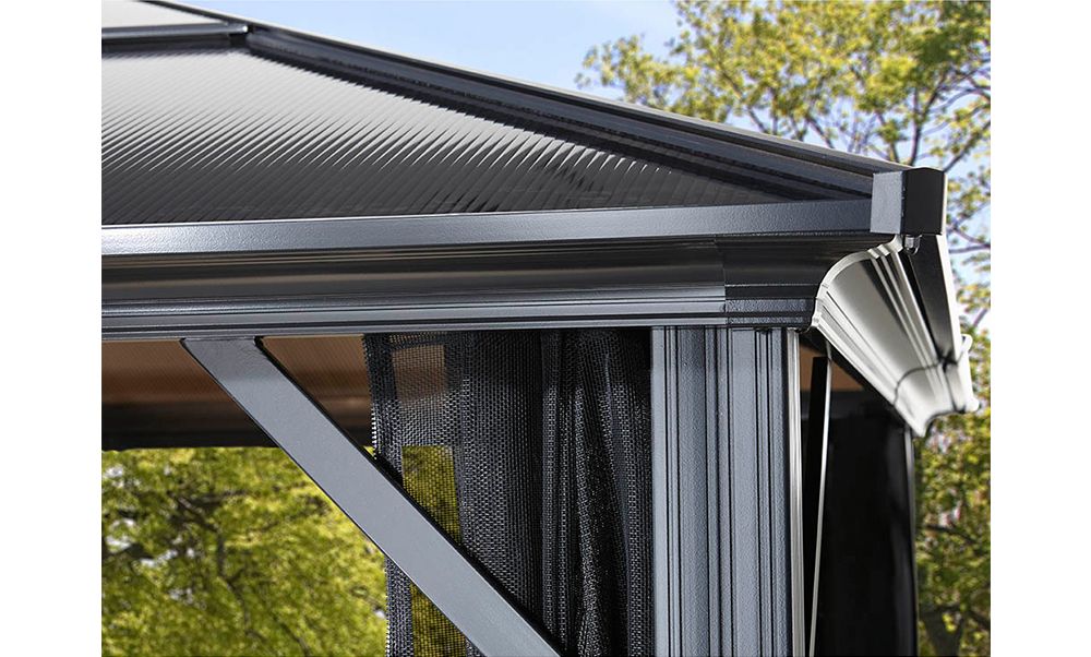 Pergolaen kommer forberedt med to rulleskinner til ophængning af det medfølgende myggenet. De samme skinner kan bruges til ophængning af gardiner, der kan købes som ekstraudstyr. Myggenettet beskytter mod myg, insekter og andre ubudne flyvende gæster. De dobbelte skinner muliggør brug af både myggenet og gardiner på samme tid.
