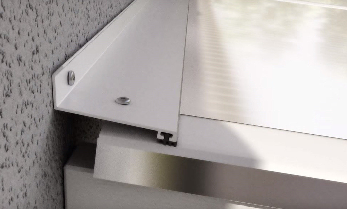 Hvid aluminiumsprofil med formonteret gummiliste, som forsegler tagkonstruktionen, holder vand væk og giver praktisk afslutning mod husets mur.