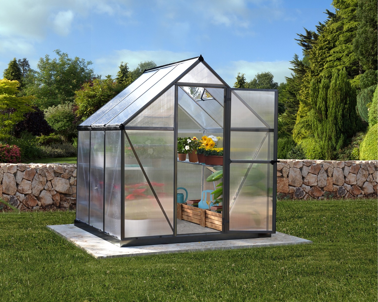 Mythos er et vedligeholdelsesfrit drivhus udført i pulverlakrede aluminiumsprofiler samt 4 mm UV-beskyttede slagfaste kanalplader af polycarbonat.