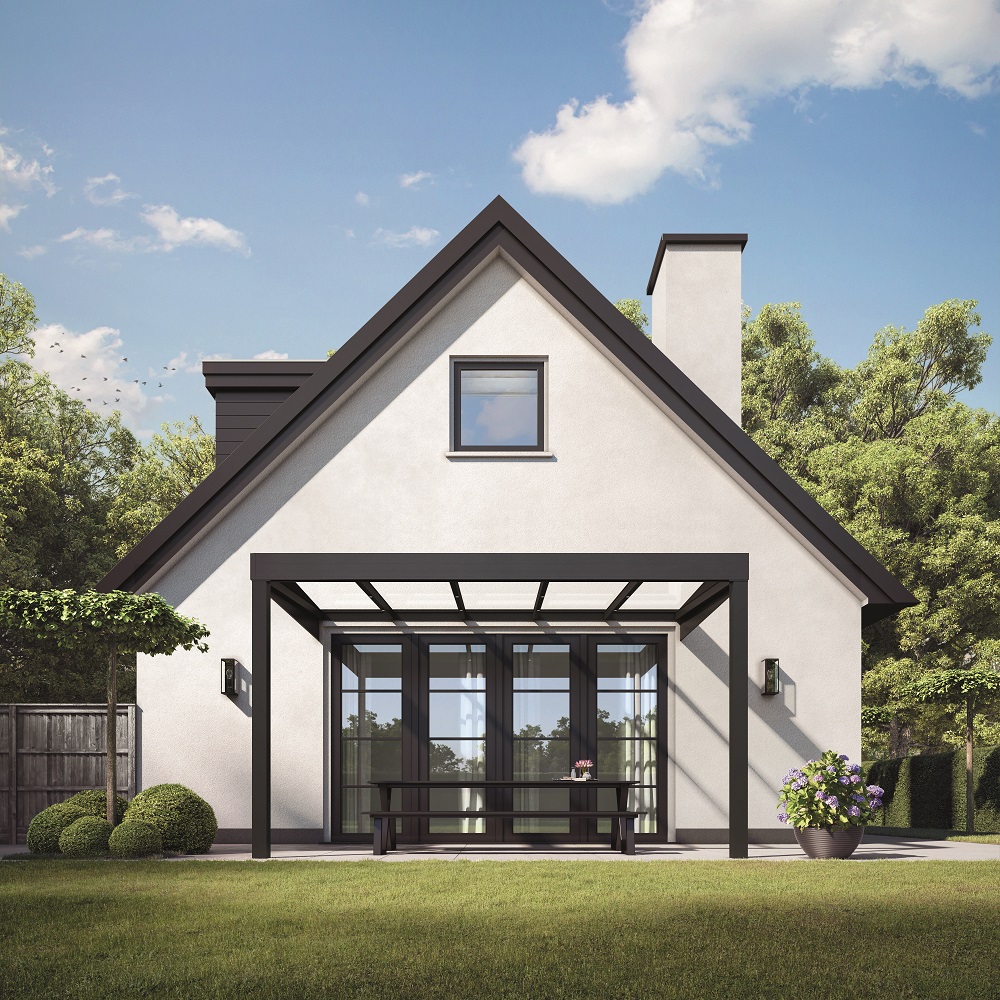 Kvalitets terrasseoverdækning leveret som et komplet samlesæt med tagplader og stolper.