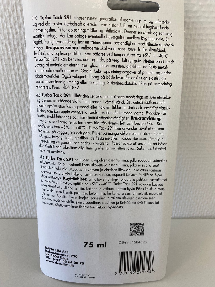 Turbo Tack 291 er den ideelle montagelim til opklæbning af spejlakryl, samt farvede akrylplader som vægbeklædning.
