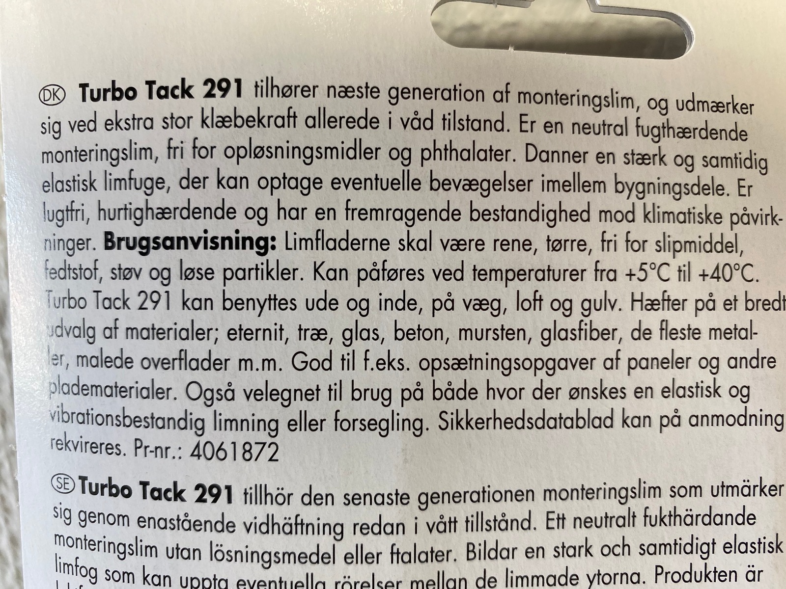 Turbo Tack 291 er en syrefri lim, og er derfor særdeles velegnet til montering af akrylspejle, idet limen ikke ødelægger spejloverfladen på spejlets bagside.